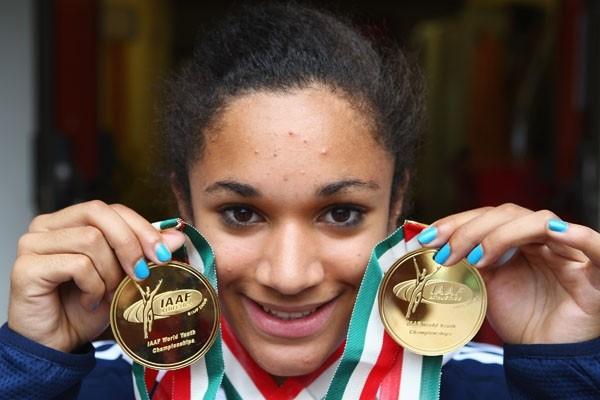 Jodie Williams of Great Britain poses with her two sprint gold medals